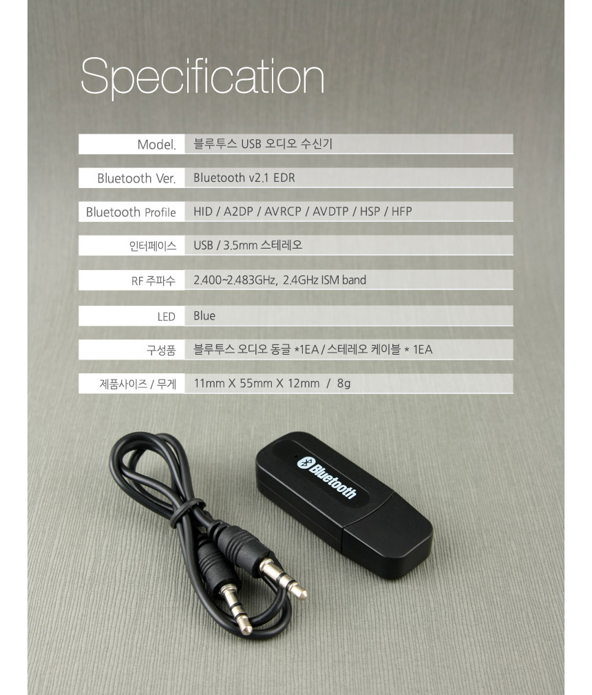 오디오 블루투스 송수신기 블루투스 기능이 없는 차량 이어폰 헤드셋 음향장비에 블루투스 수신할 수 있도록 하는 장비 오디오를 블루투스 수신 하는 어뎁터 연결단자 USB AUX 3.5mm 잭 블루투스 최대 10m 핸즈프리 컴팩트한 사이즈 깔끔한 디자인 사이즈 11 x 55 x 12 mm 무게 8g 구성 수신기 3.5mm 스테레오 케이블 - 오호! OHOI