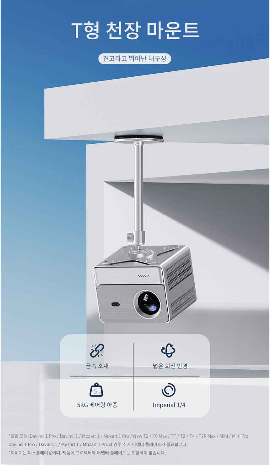 완보 빔 프로젝터 T형 천장 마운트 완보 빔 프로젝터 Mozart1 을 천정 거치하기 위한 마운트 스탠드 메탈소재로 안정성 확보 360도 조절 가능한 볼 마운트 1/4 인치 6mm 나사산 1/4인치 나사홀 프로젝터 카메라 등에 호환 5Kg 하중 용량 적절한 눈높이로 편안한 시청 환경 제공 단순하지만 견고한 설계 - 오호! OHOI
