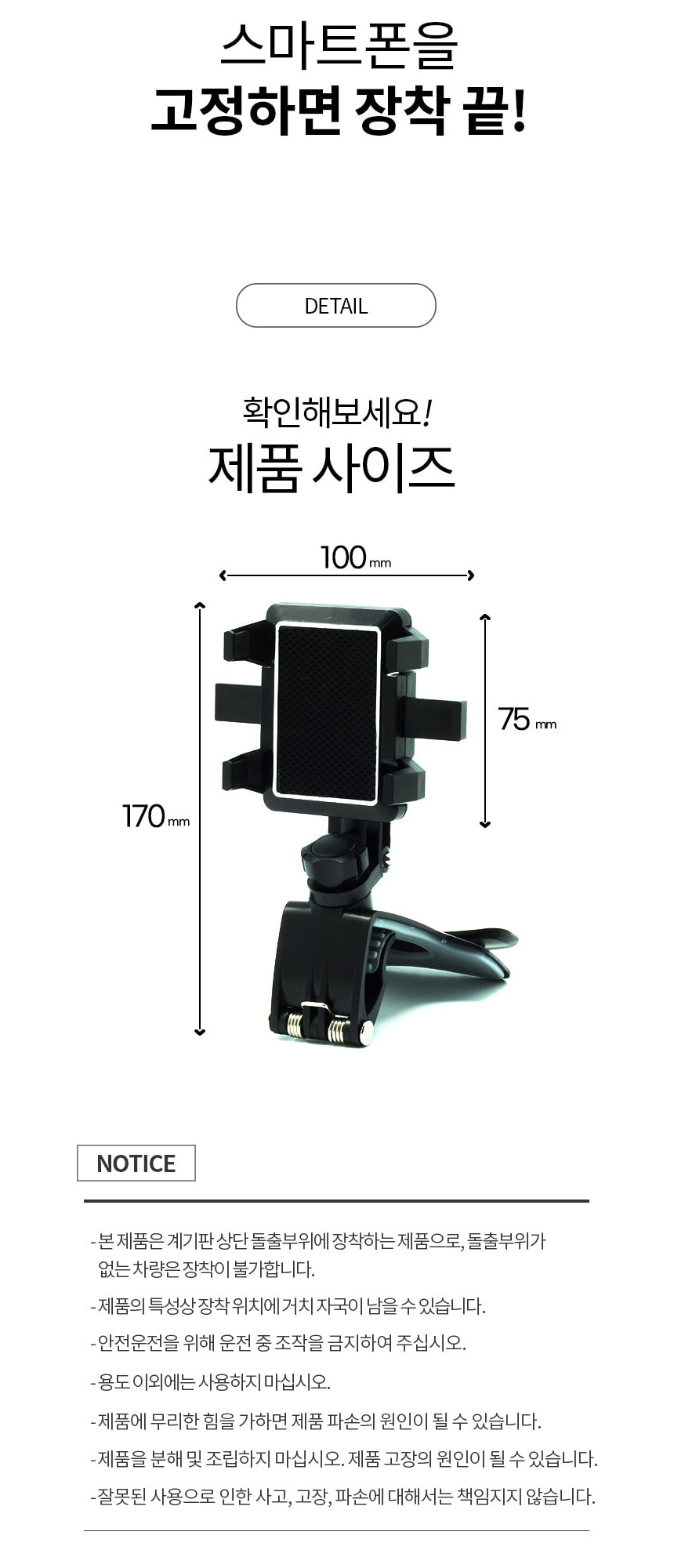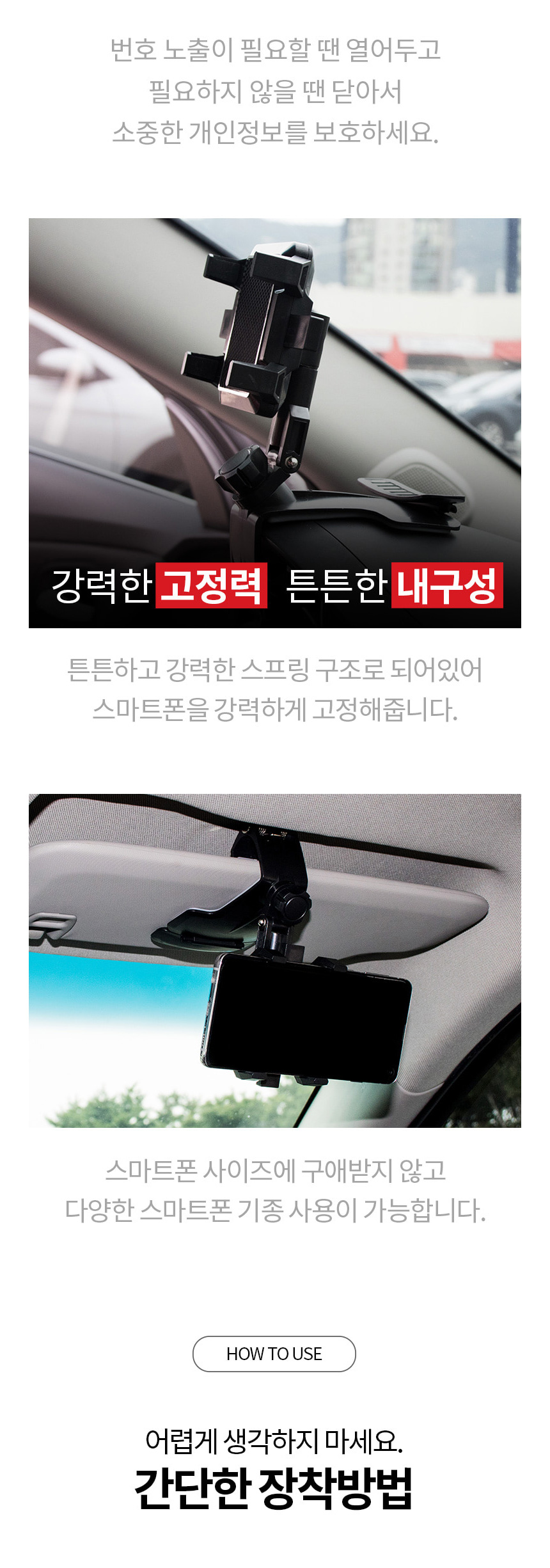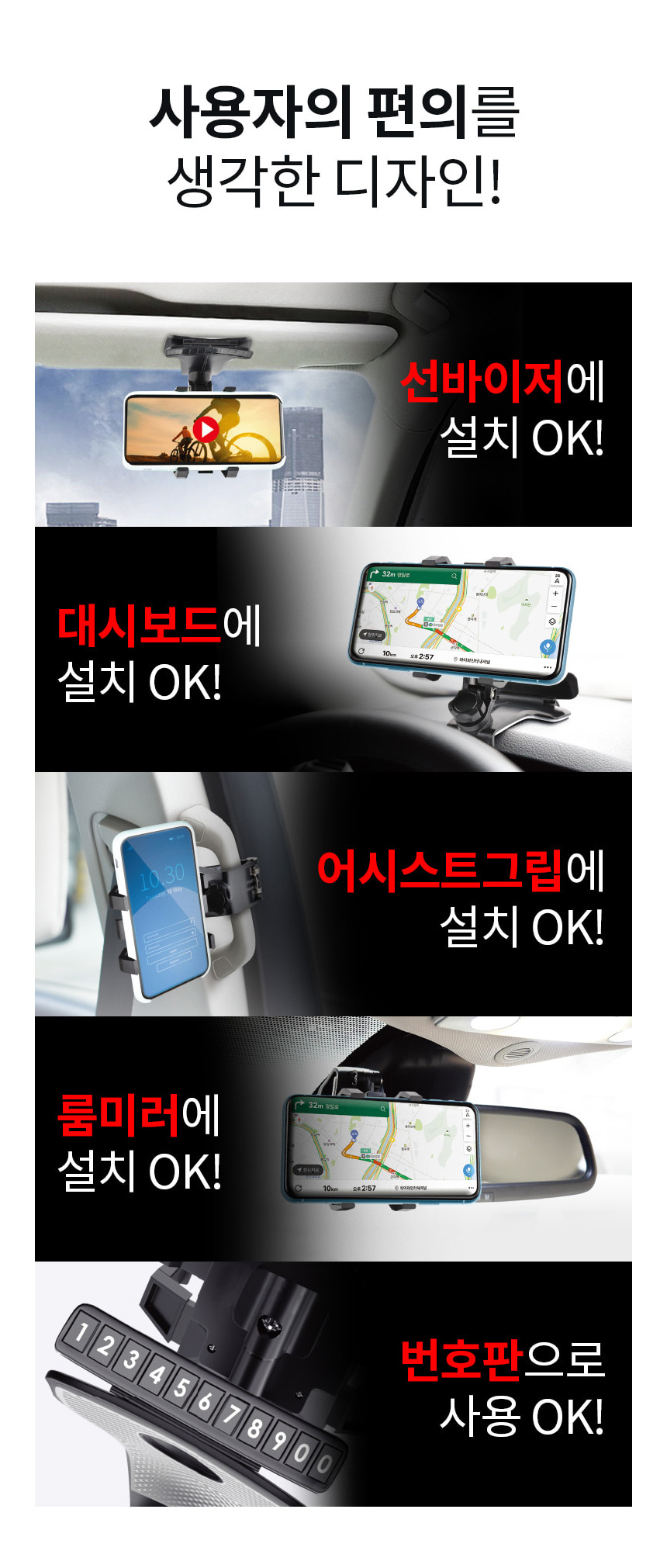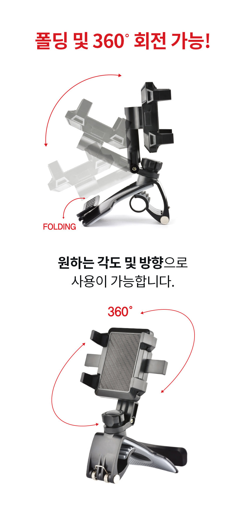차량용 휴대폰 스마트폰 거치대 받침대 계기판 대쉬보드 클립형 스마트폰 고정 홀더 튼튼한 스피링 클립 손가락 홀더 360도 볼헤드 각도조절 길이조절 다양한 기기 거치에 활용 수려한 피니쉬 마감 휴대폰 번호판 숫자판 고무패드 실리콘패드 대쉬보드 외 썬바이저 룸미러 등에 응용설치 가능한 모델 - 오호! OHOI