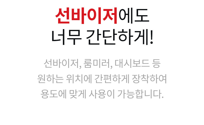 ※ 대쉬보드 외 , 썬바이저 , 룸미러 등에 응용설치 가능한 모델입니다.