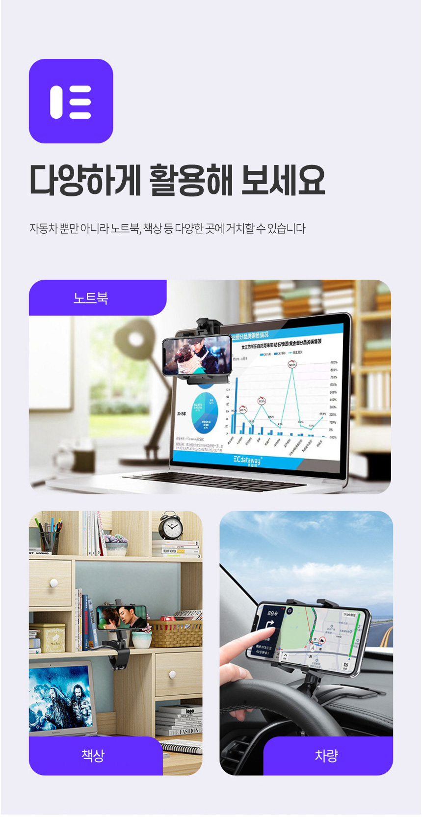※ 대쉬보드 외 , 썬바이저 , 룸미러 등에 응용설치 가능한 모델입니다.