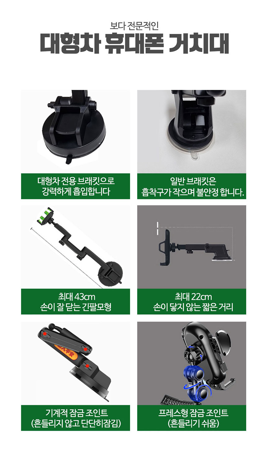 차량용 휴대폰스마트폰 거치대 받침대 대쉬보드 유리 흡착식 팝업 흡착식 롱 스트레치 대형차 화물차 휴대폰거치대 차량용 거치대 흡착식 고정 홀더 가이드 거치형 차량에 고정방식 원터치 흡착형 흡착판 각도조절 360도 볼헤드 3단 거치각도 조정 미끄럼 방지 실리콘패드 3단 각도 조정으로 거치대 길이 조절 가능 최대 43cm 구성 스마트폰 홀더 흡착거치대- 오호! OHOI