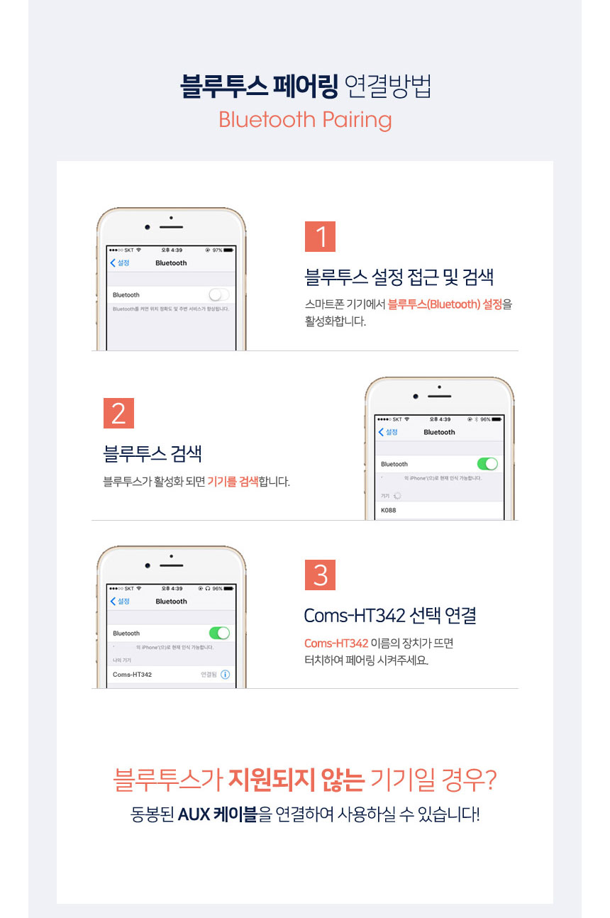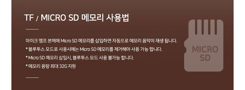 음원연결 : 블루투스 V4.2 무선연결 , AUX 유선연결 , TF메모리 (최대32G)