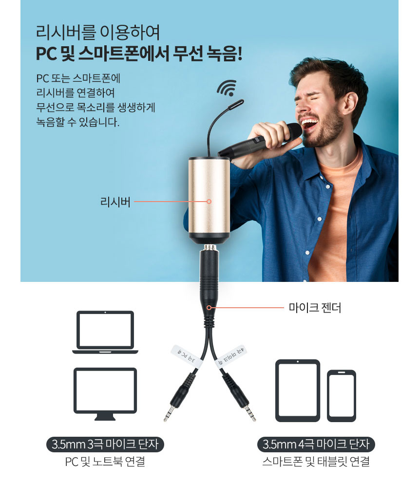 노트북/PC , 휴대폰 등에 수신기를 설치하여 무선마이크 사용