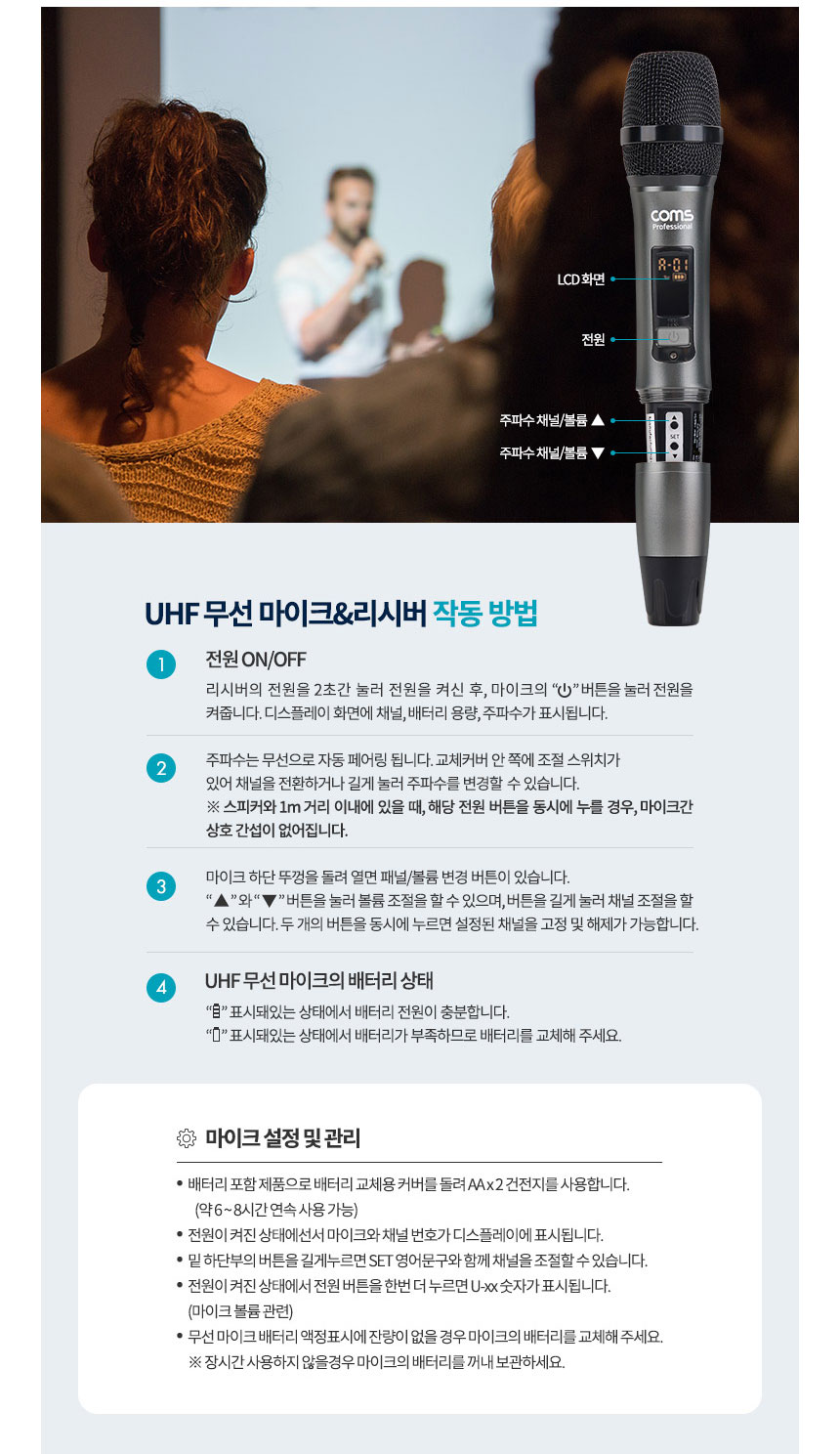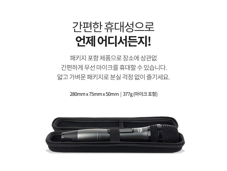 전원 : 무선마이크 - AA 배터리 2개 (포함) , 수신기 - 충전식 5V
