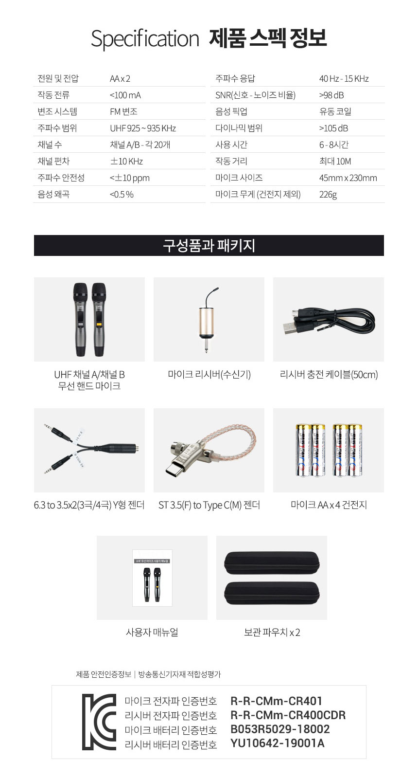 구성 : 무선마이크 x 2 , 수신기 (리시버) , 충전 케이블 , 변환젠더 2종 , AA 배터리, 설명서 , 케이스