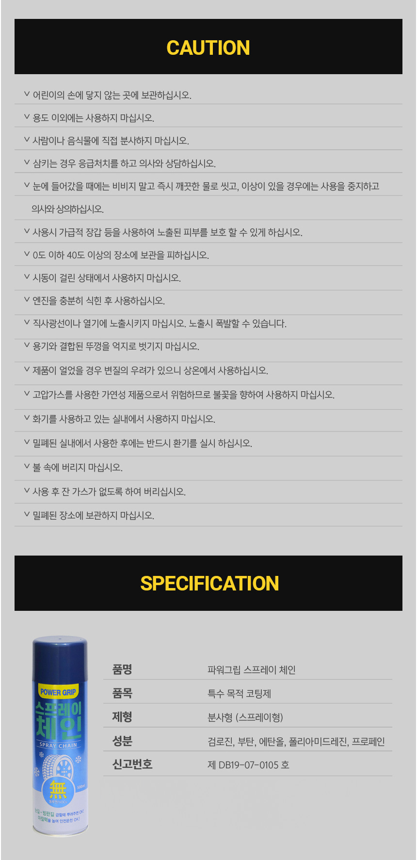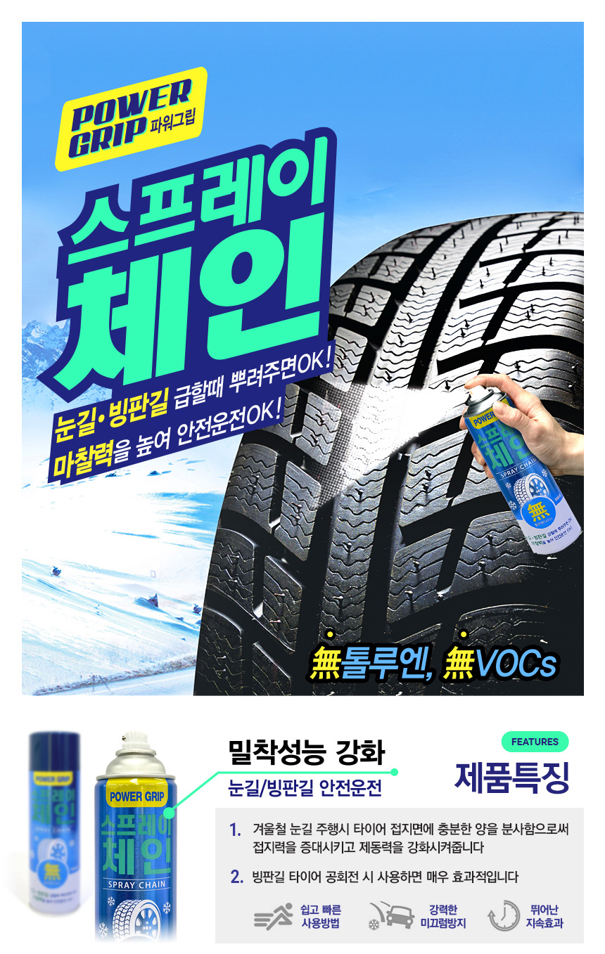 파워그립 스프레이 체인 마찰력을 높여 눈길 빙판길에서 안전운전을 돕는 스프레이 체인 다용도 활용 자동차 오토바이 자전거 신발 등에 사용 강력한 ASP 코팅성분에 고분자 합성수지 성분 함유 탁월한 성능 발휘 휠 브레이크 라이닝 손상 X 타이어 경화/변색 X 용량 500ml 원산지 대한민국 - 오호! OHOI
