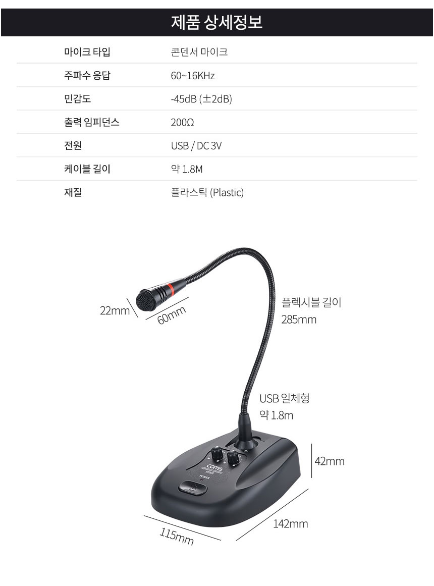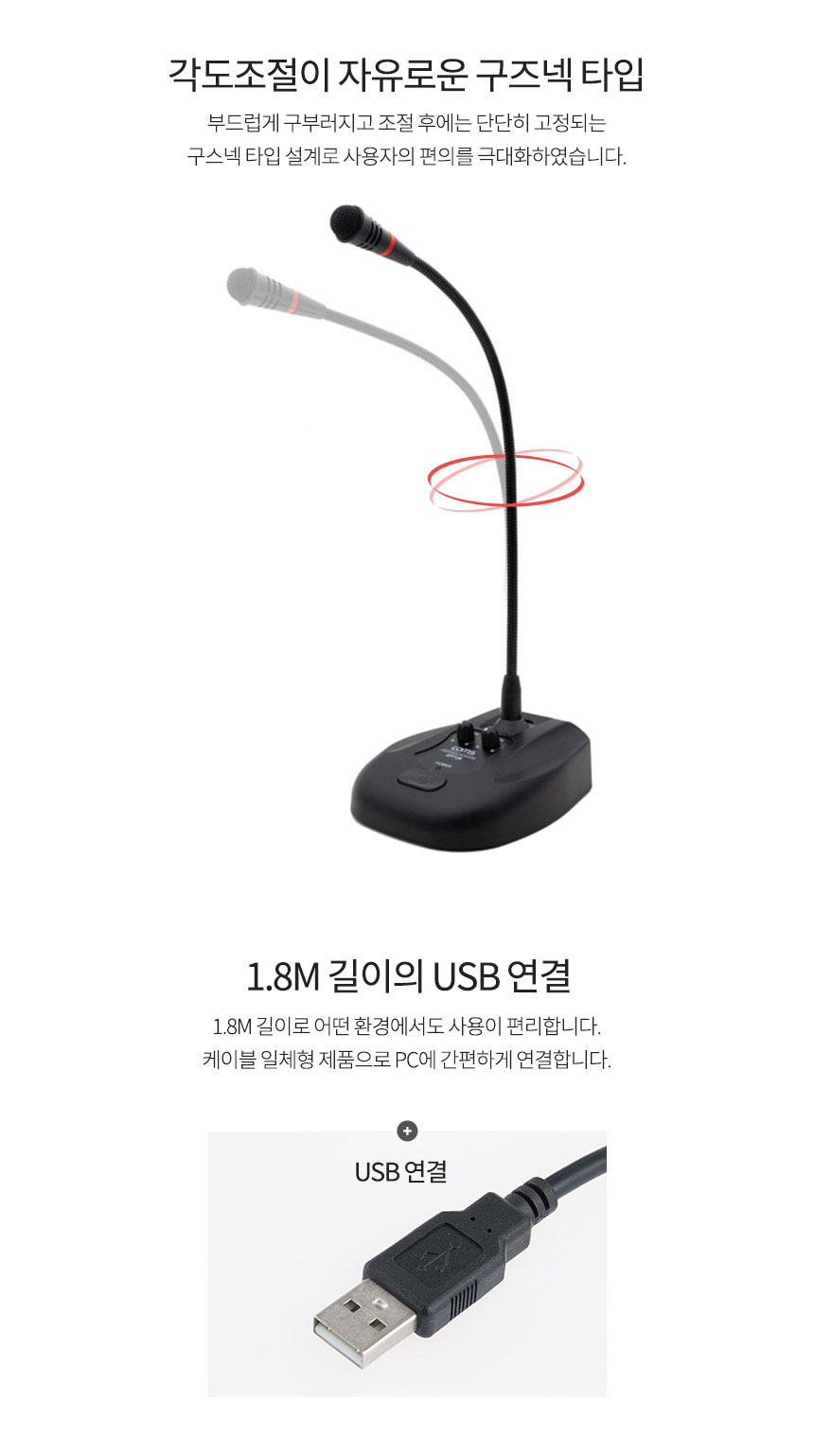 고감도 컴퓨터 PC 구즈넥 마이크 회의용 채팅 방송 녹음용 ON OFF 스위치 볼륨조절 에코조절 LED 전원표시등 콘덴서 마이크 USB 단자 C 타입 단자 케이블 길이 1.8m 마이크목 길이 38cm 전원공급 USB DC3V 윈드스크린 방풍솜 안정적 주파수 뛰어난 성능 잡음 - 오호! OHOI
