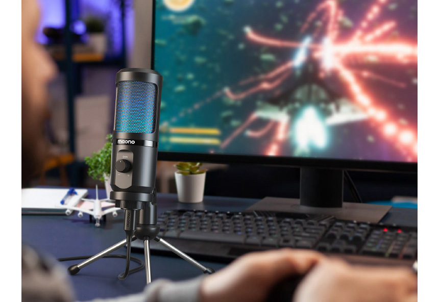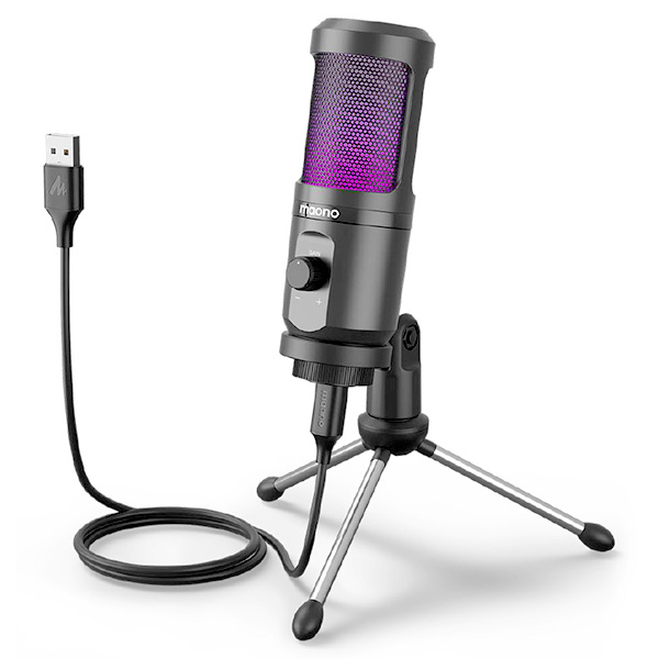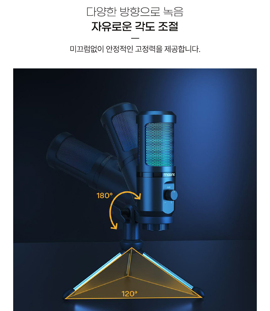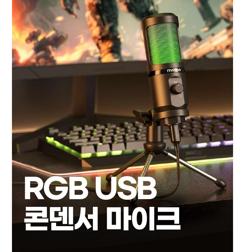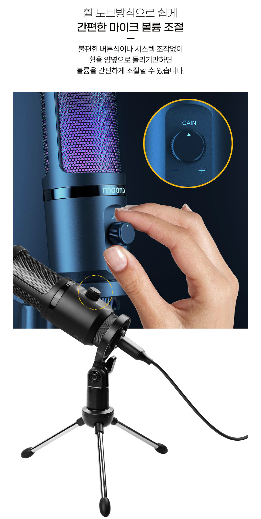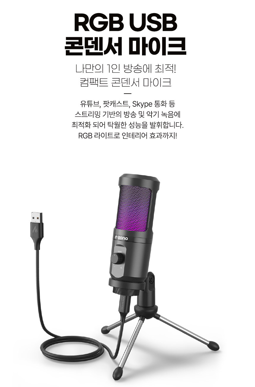 고감도 컴퓨터 PC 스탠드 콘덴서 단일지향성 USB 마이크 회의용 채팅 방송 녹음용 탁상용 삼각대 받침대 각도조절 케이블길이 1.5m USB A to C 변환젠더 볼륨조절 RGB LED 표시등 - 오호! OHOI