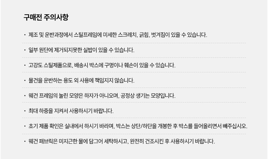 ※ 제조/운반과정에서 스틸프레임에 미세한 스크레치 , 긁힘 , 벗겨짐 , 눌림이 있을 수 있습니다.위 사유로 불량반품처리가 안되오니 이점 양해바랍니다.