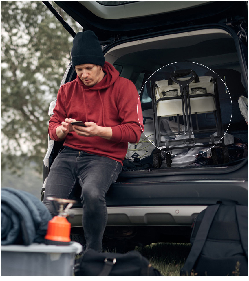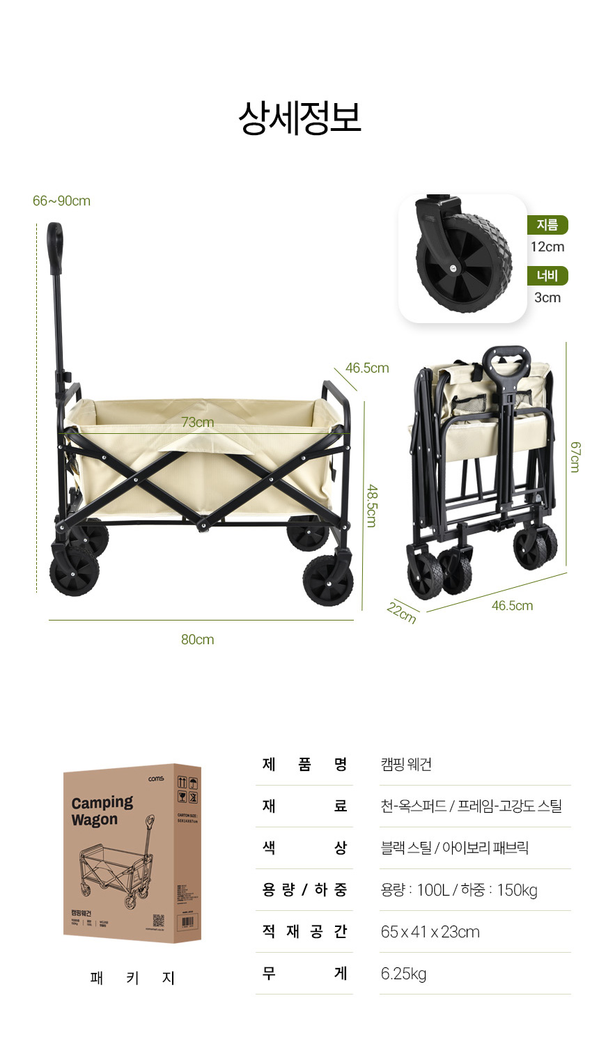휴대용 바퀴 받침대 접이식 핸드카트 쇼핑카트 손수레 대차 카트 구루마 핸드트럭 시장가방 캠핑웨건 접이식 캐리어 카트 접이식 캠핑웨건 핸드카트 최대하중 150 kg 적재공간 스틸프레임에 벨크로 고정 탈부착용이 세탁가능 적재공간 크기 100L 대용량 65 x 41 x 23cm 적재공간 원단 도툼한 패브릭 원단 스크래치 오염에 강해 캠핑 등에 적합 손잡이 길이조절 65- 90 cm 이내 자유조절 손잡이 각도조절 180도 부드럽게 조절되는 핸들관절 바퀴 360도 회전 격자 디자인 아웃도어에서도 안정적인 주행 바퀴 사이즈 지름 12cm 너비 3cm 보조 수납 포켓 접이식 보관 휴대 용이 고강도 스틸 프레임 - 오호! OHOI