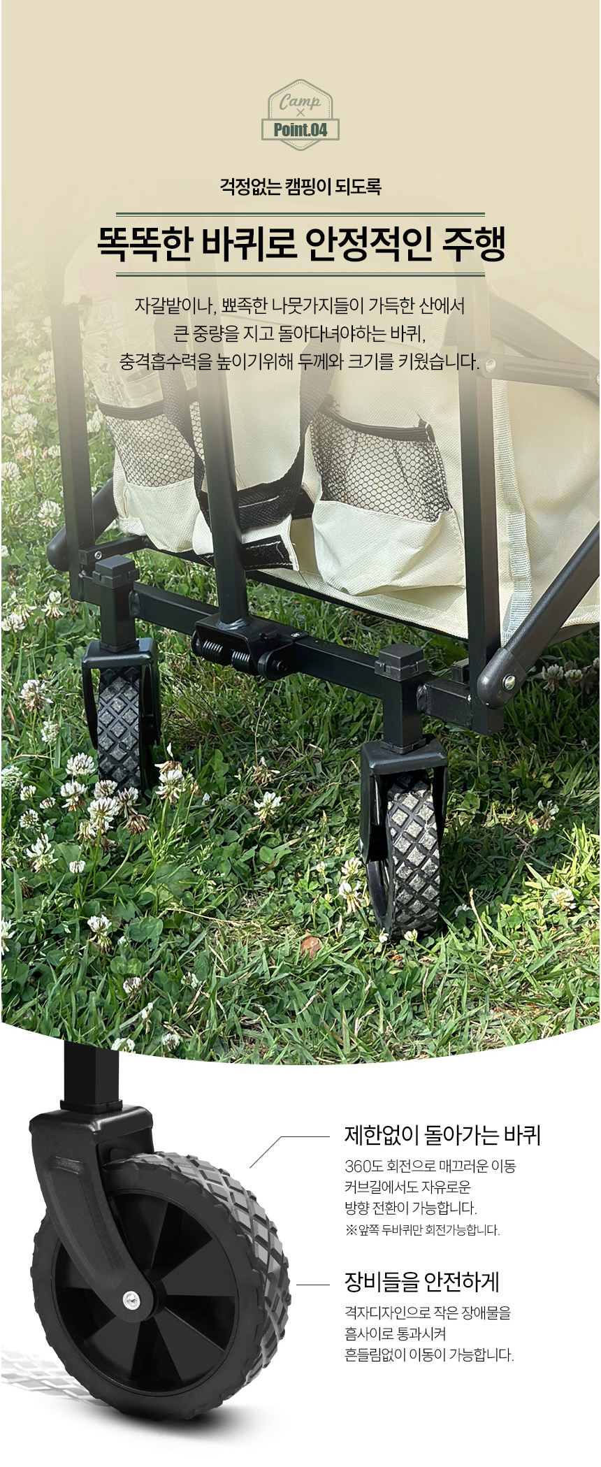 바퀴 : 360도 회전 , 격자 디자인 - 아웃도어에서도 안정적인 주행