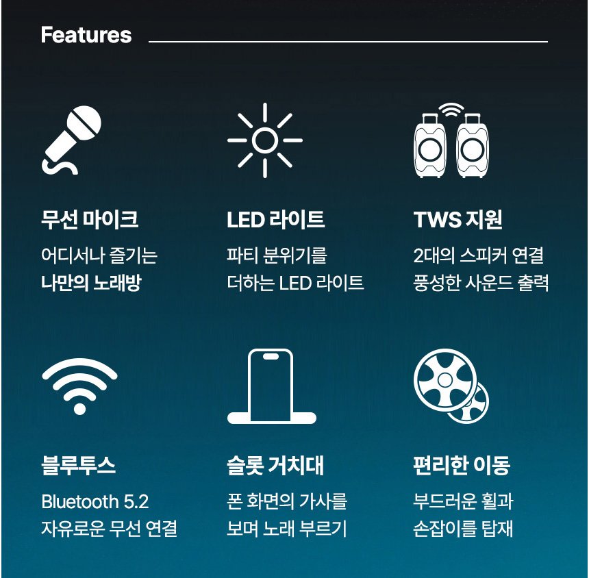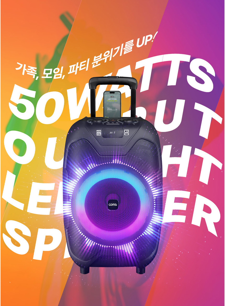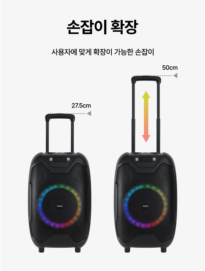 휴대용 앰프 스피커 FM 라디오 MP3 플레이어 블루투스 스피커 앰프 스피커 출력 50W 무선 마이크 1개 블루투스 TWS 연결 2채널 스테레오 지원 제공 녹음기능 ○ 볼륨 베이스 마이크 볼륨 조정가능 직권적인 조작버튼 포트 단자 USB포트 AUX 단자 MIC 단자 2개 기타(Guitar)전용 입력단자 스피커 라이트 간편한 이동 2단 캐리어형 손잡이 이동 바퀴 충전식 배터리 DC 전원 어댑터로 충전 충전시간 6~8시간 재생 시간 3~5시간 스피커 스탠드 연결가능 스탠드 별도구매 구성 기기본체 리모콘 무선 마이크 1개 충전 어댑터 사용설명서 - 오호! OHOI