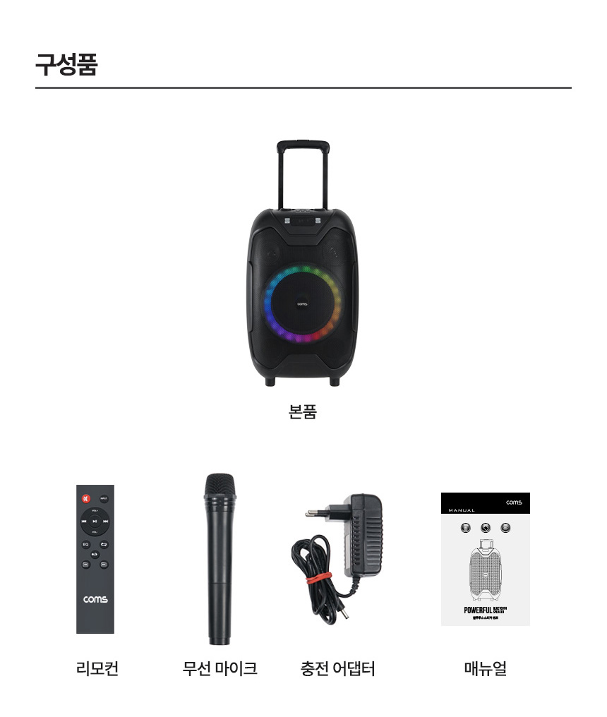 구성 : 기기본체 , 리모콘 , 무선 마이크 1개 , 충전 어댑터 , 사용설명서