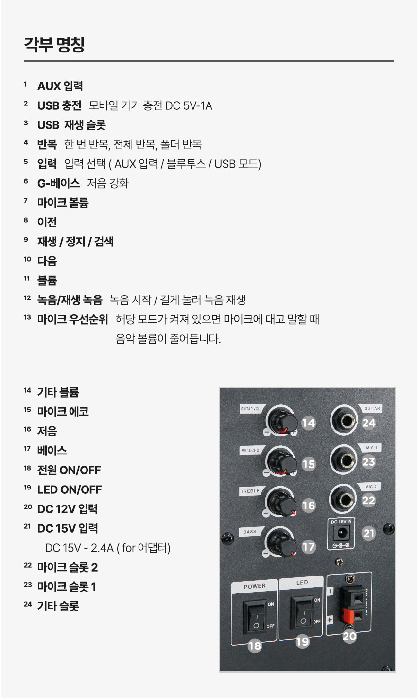 포트/단자 : USB포트 , AUX 단자 , MIC 단자 2개, 기타(Guitar)전용 입력단자