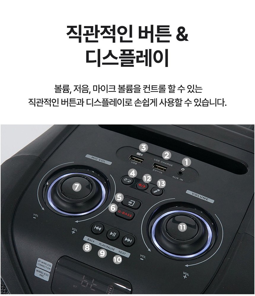녹음기능 ○ , 볼륨- 베이스 - 마이크 볼륨 조정가능 , 직권적인 조작버튼
