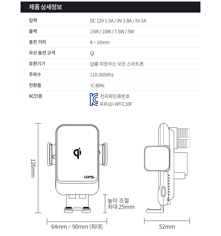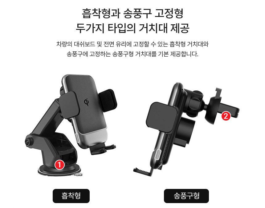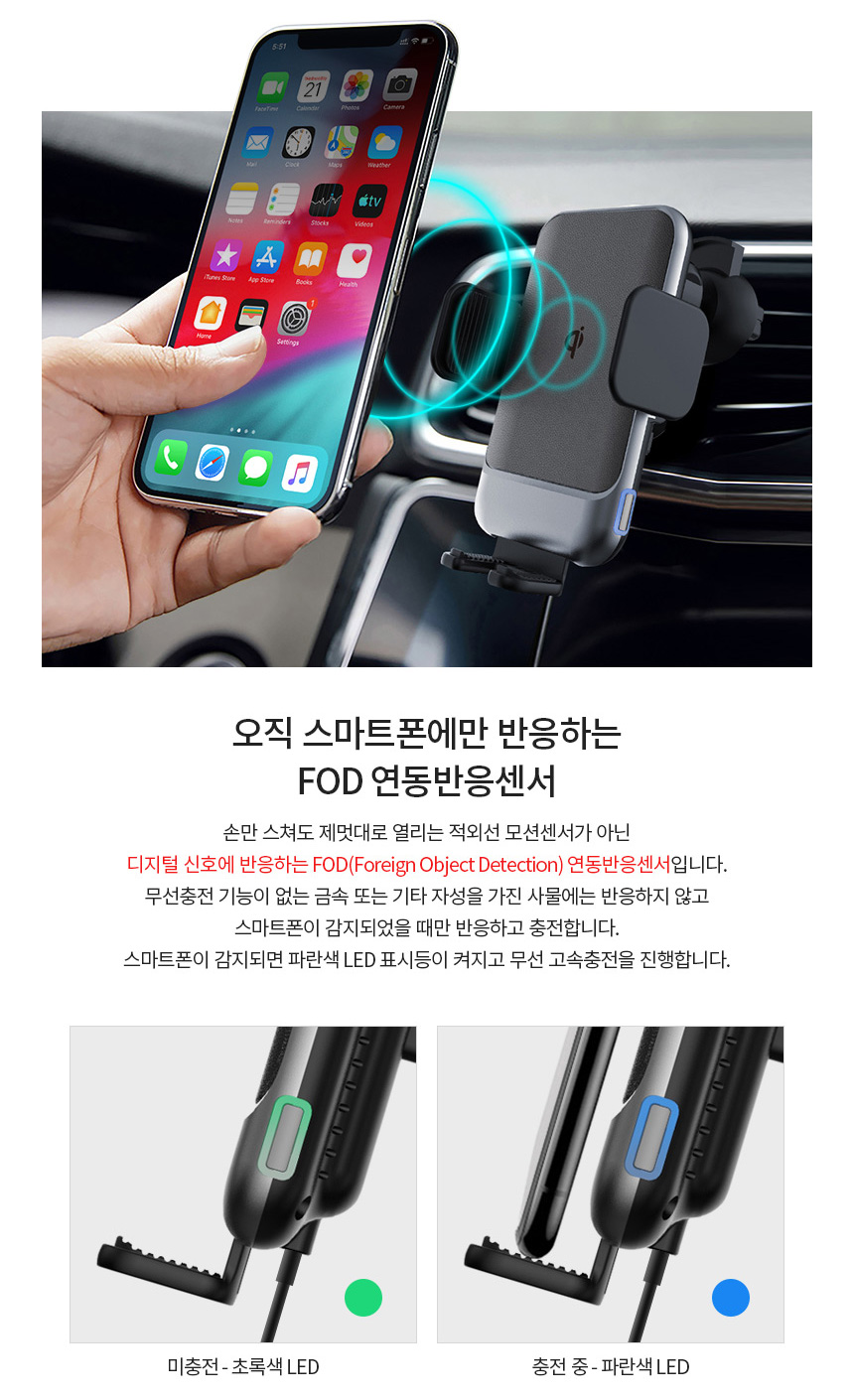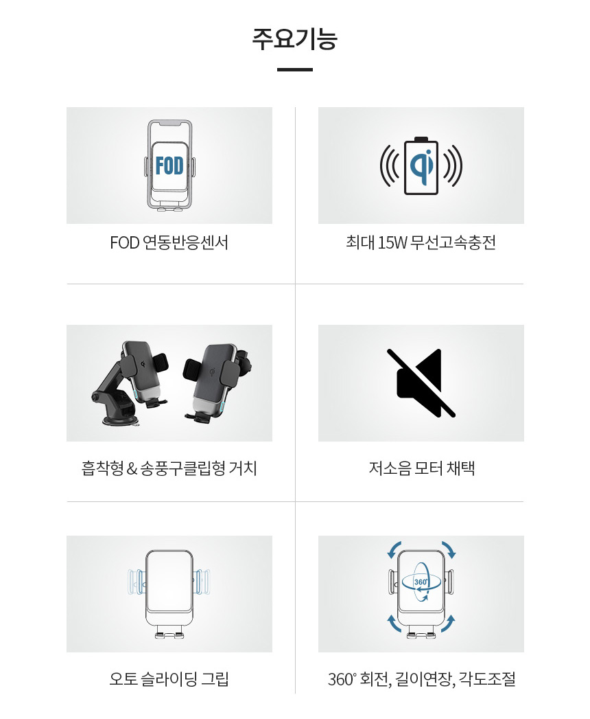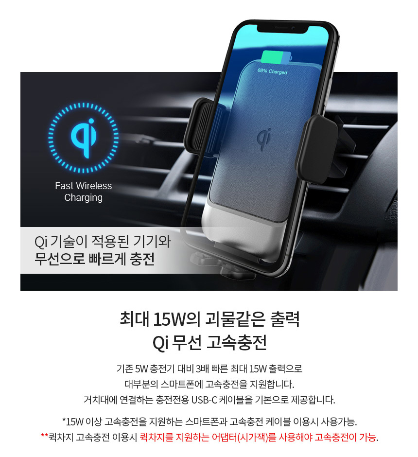 차량용 휴대폰 스마트폰 거치대 받침대 대쉬보드 유리 흡착식 원터치 고정 젤패드 송풍구형 거치 스마트폰 고정 FOD센서 스마트폰만 자동인식 자동거치 예비 전력 시스템 시동 OFF에도 탈착가능 360도 볼헤드 각도조절 길이조절 다양한 기기 거치에 활용 수려한 피니쉬 마감 국제표준 qi 인증 무선충전 시스템 15W 고속충전 스마트 IC 적용 충전규격 자동인식 다중보호회로 정전기방지 과전압보호 과열방지 단락보호 구성 무선충전패드 송풍구거치대 흡착형거치대 C타입USB케이블 사용자 설명서 - 오호! OHOI