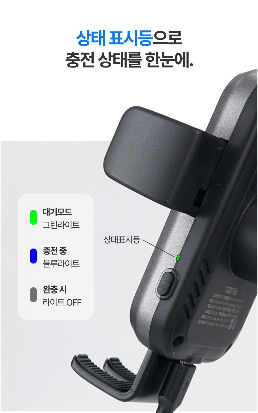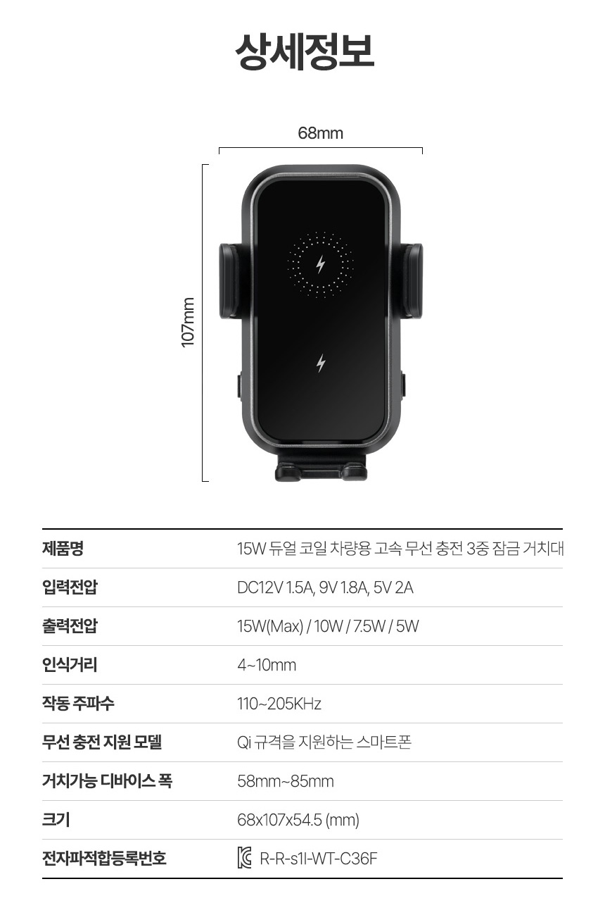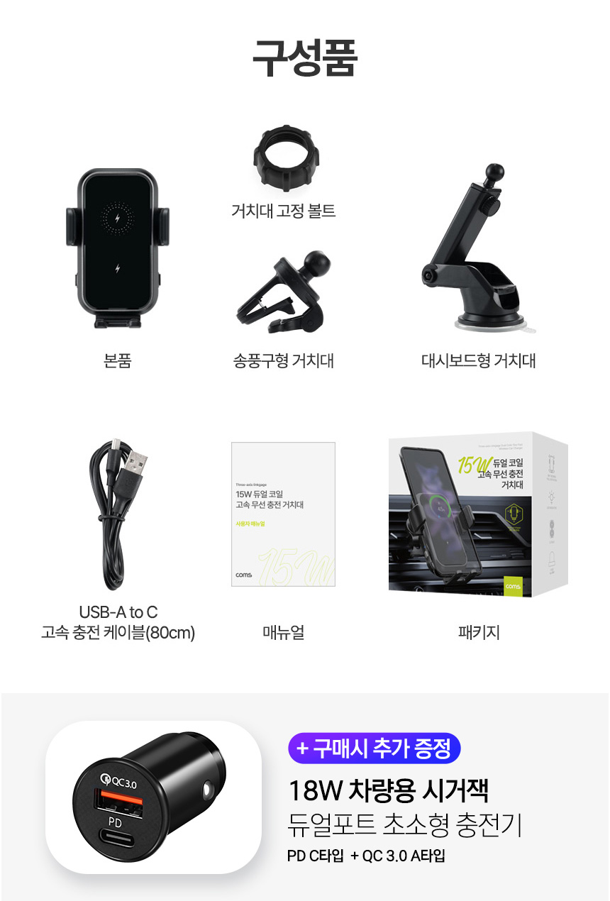 구성 : 무선충전패드 , 송풍구거치대 , 흡착형거치대 , C타입USB케이블 , 사용자 설명서 , 증정품