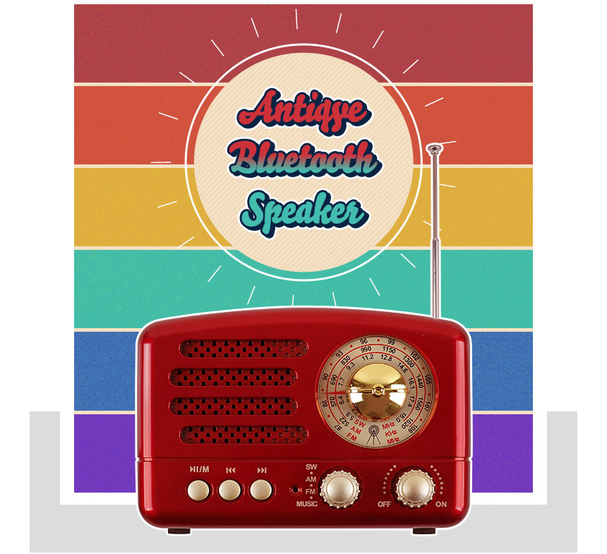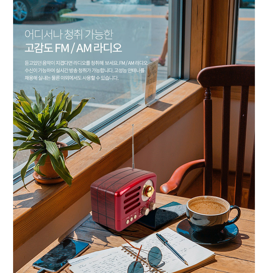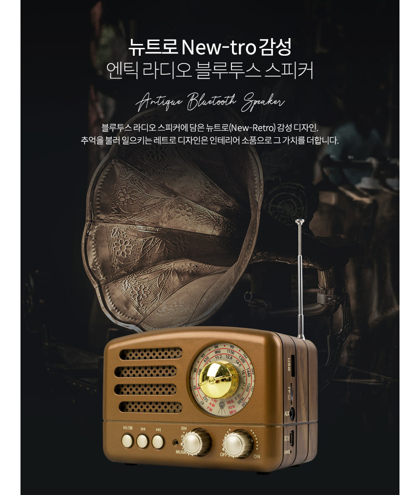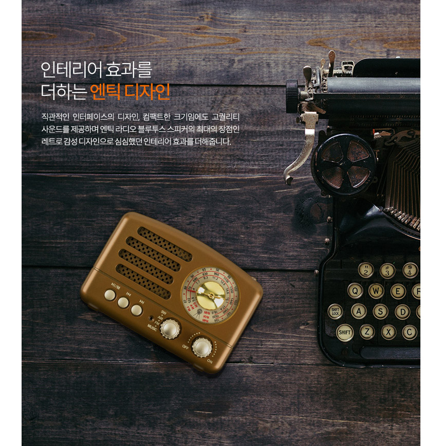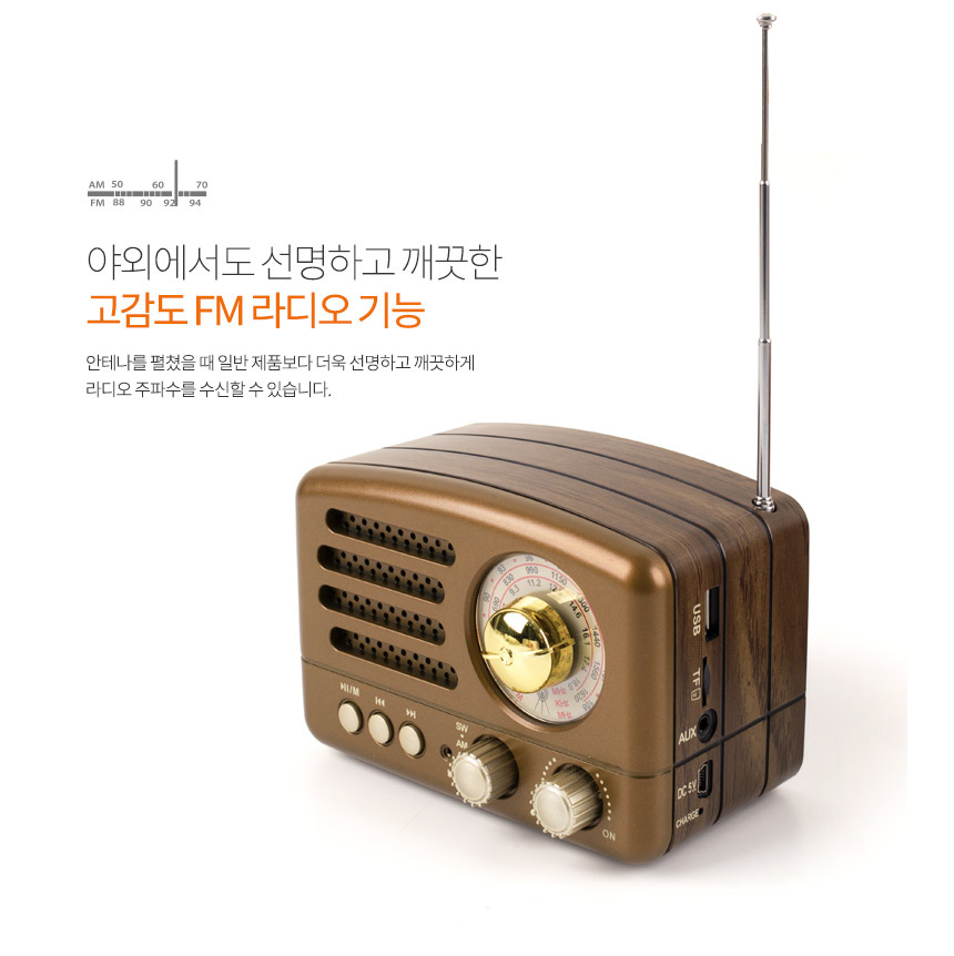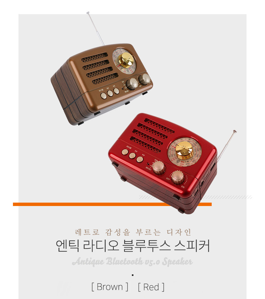 앤틱 클래식 디자인 효도 소형 미니 휴대용 AM FM 라디오 스피커 MP3 SD카드 USB 메모리 AUX 단자 포트 블루투스 5.0v 포터블 탁상용 캠핑 낚시 등산용 충전식 배터리 내장 조그다이얼 주파수 조작 - 오호! OHOI