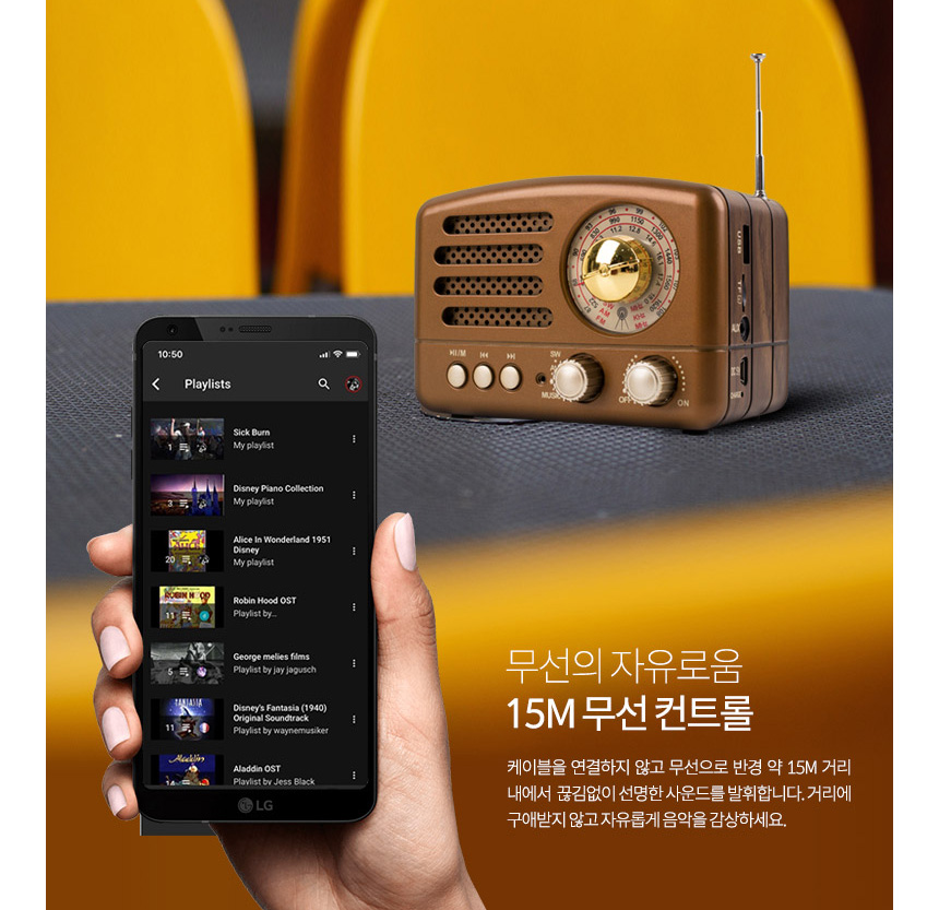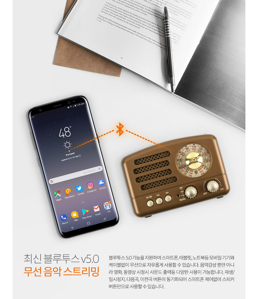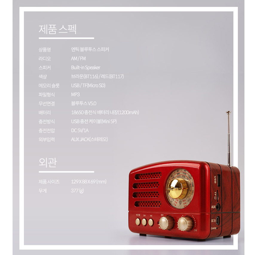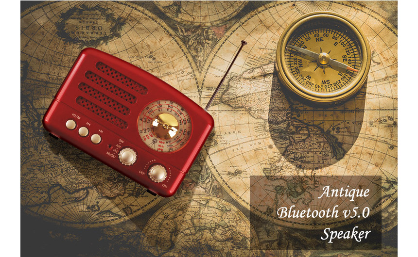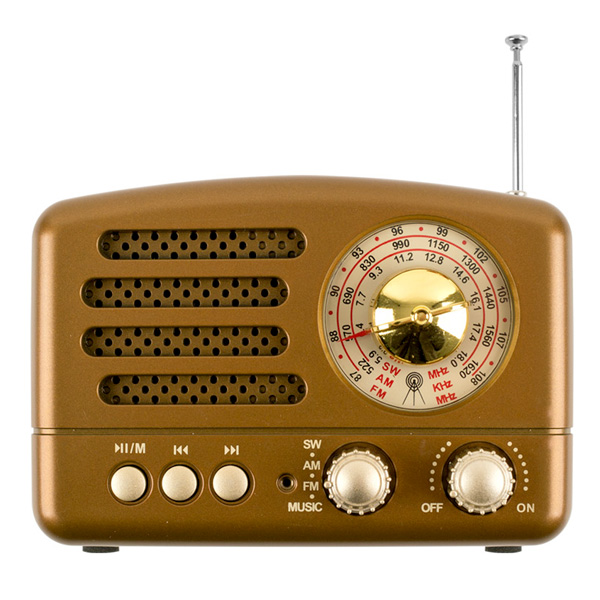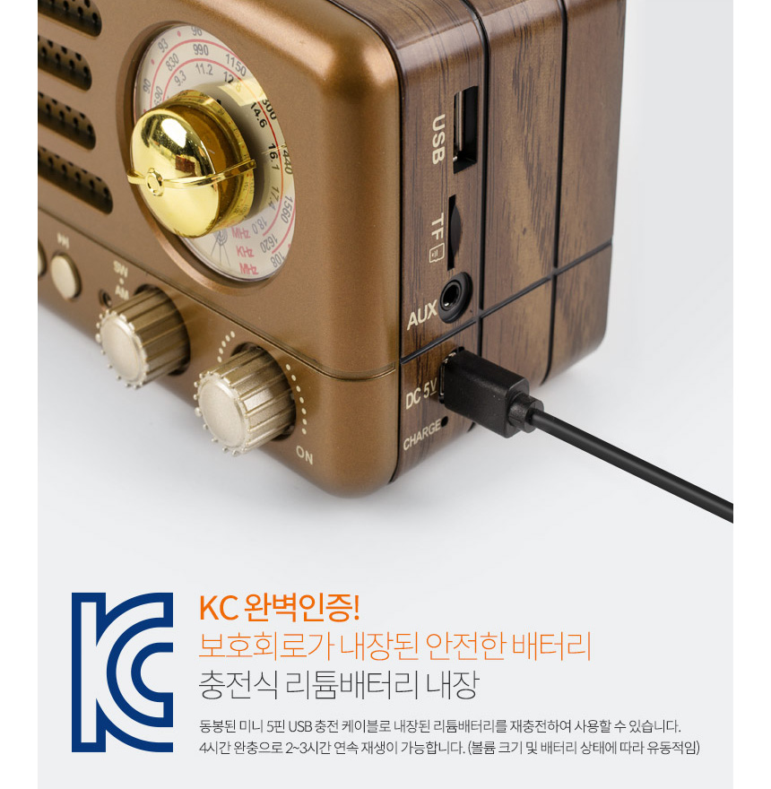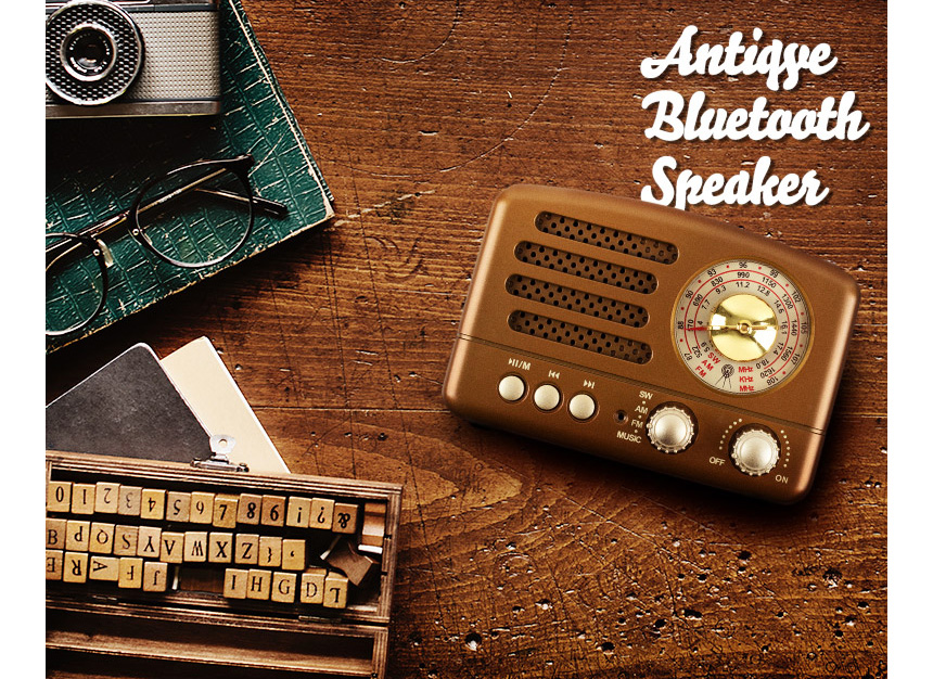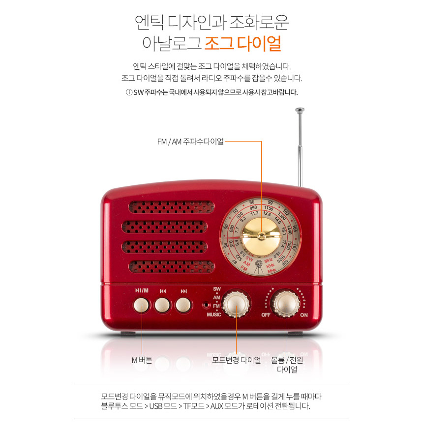 앤틱 클래식 디자인 효도 소형 미니 휴대용 AM FM 라디오 스피커 MP3 SD카드 USB 메모리 AUX 단자 포트 블루투스 5.0v 포터블 탁상용 캠핑 낚시 등산용 충전식 배터리 내장 조그다이얼 주파수 조작 - 오호! OHOI