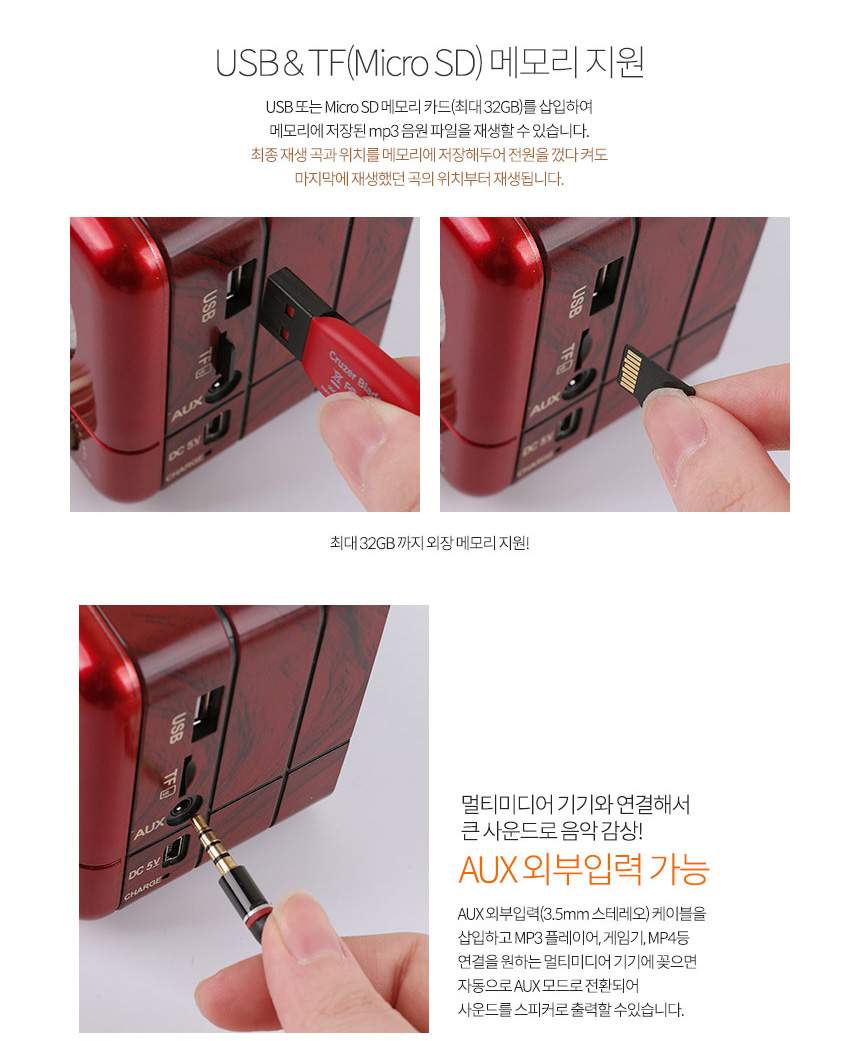 블루투스 V5.0, USB 포트, TF 포트, AUX 단자