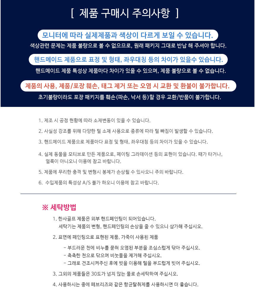 불량, 오배송 등 판매자 귀책 반품/교환 : 상품 수령 후 7일이내 (판매자 반품배송비 부담)