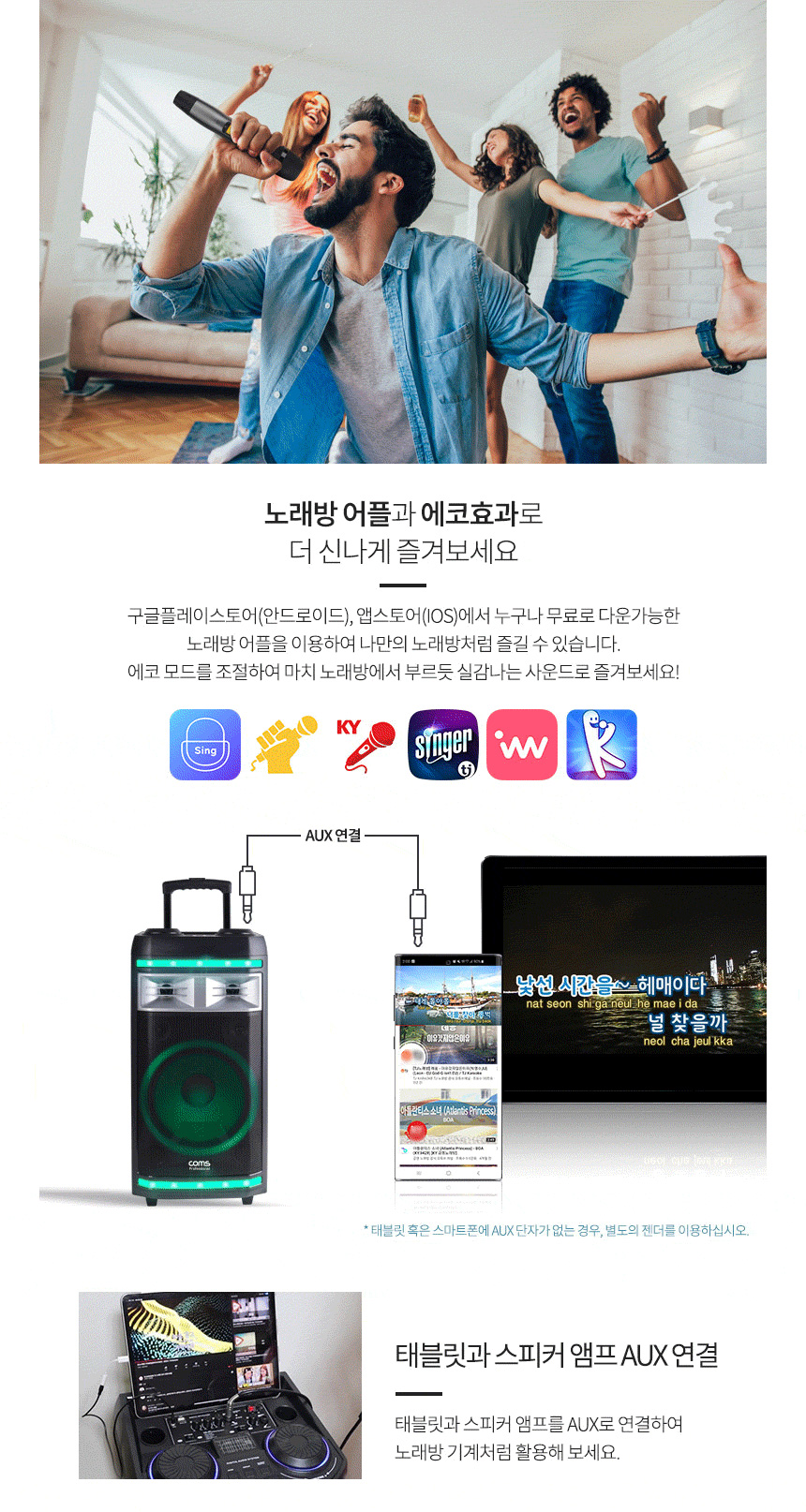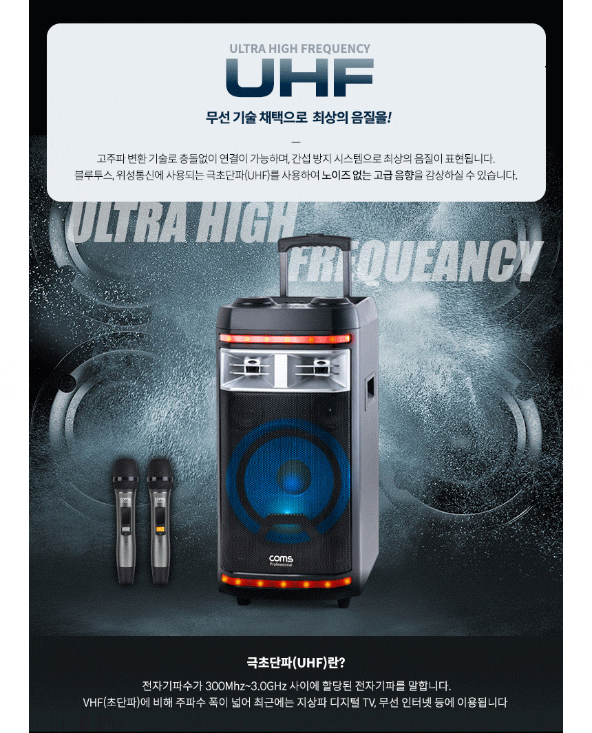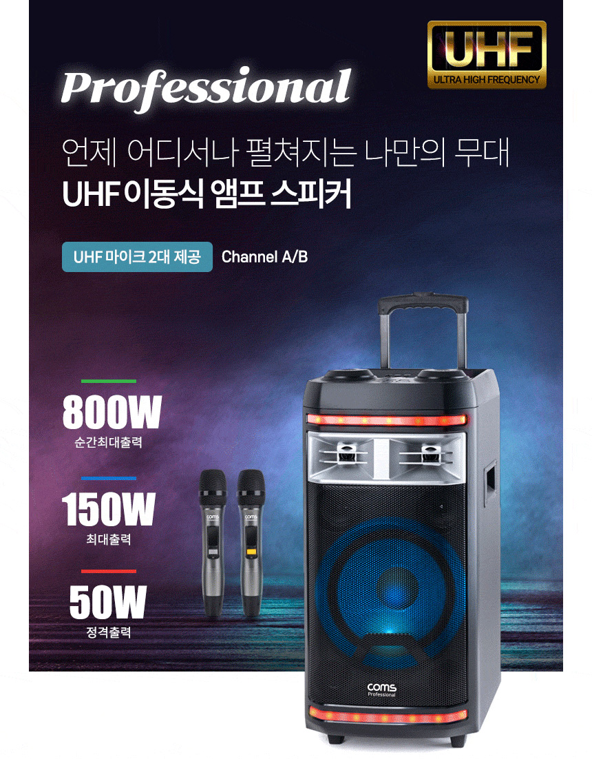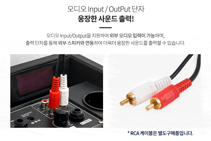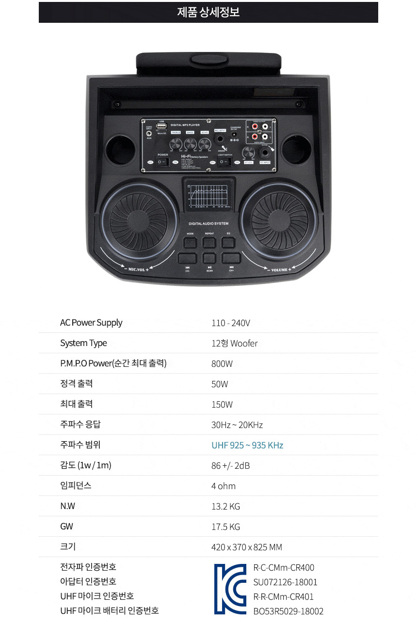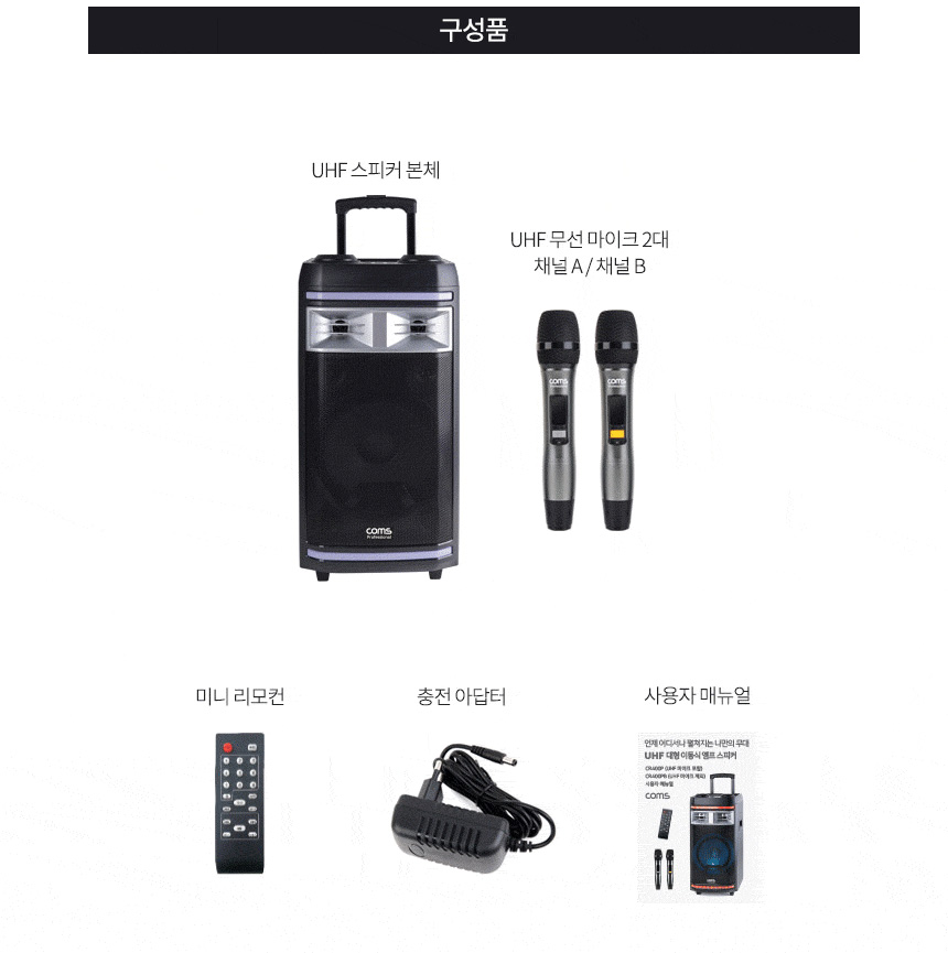 구성 : 기기본체, 리모콘, UHF 무선 마이크 2개, 충전어댑터, 사용설명서
