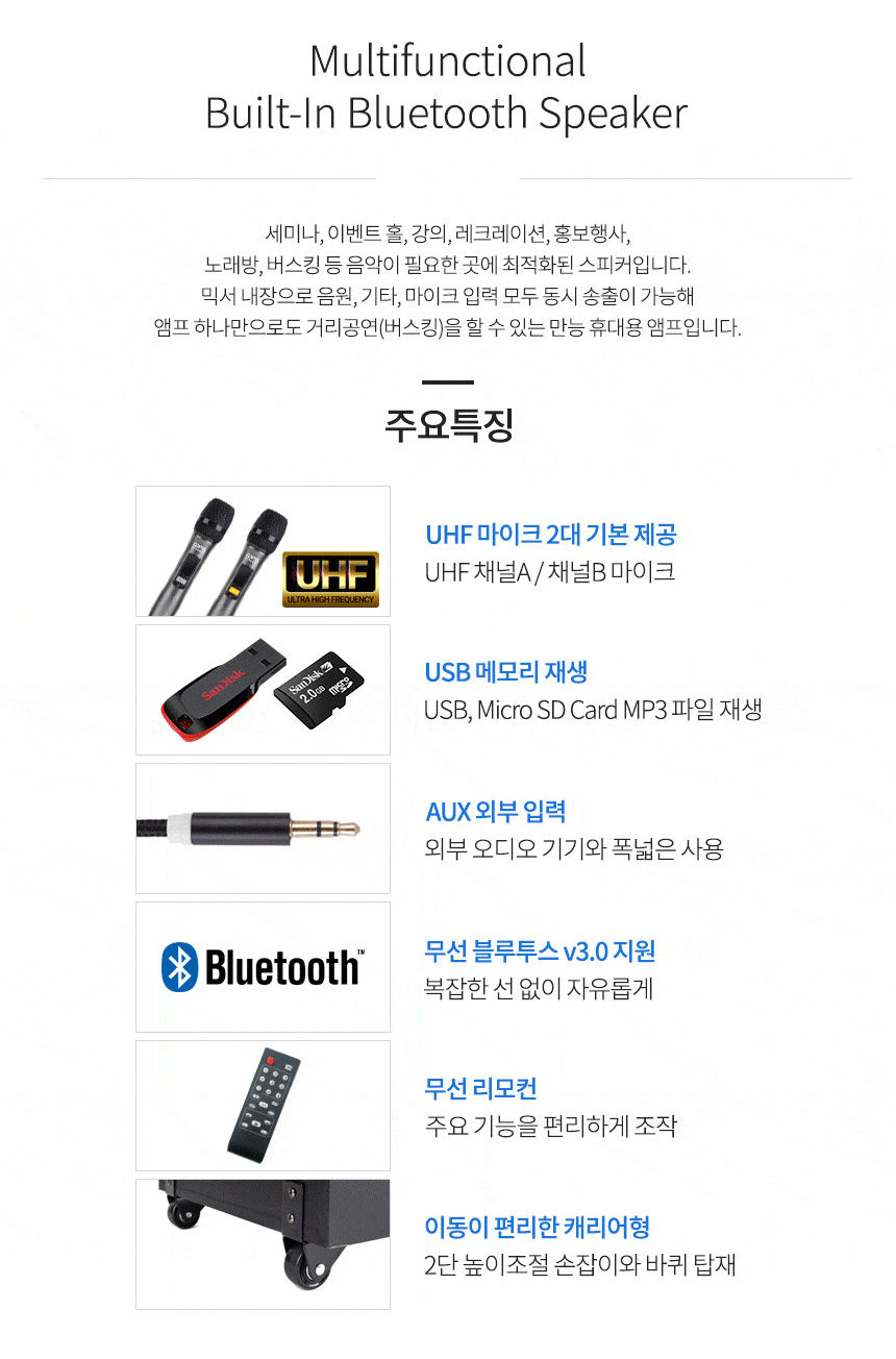 - HOME > 음향가전 > 기가폰/메가폰/이동식앰프 > 이동식앰프 > 이동식 블루투스 앰프 스피커 무선 마이크 버스킹 야외 공연 가이드 행사 강의 휴대용