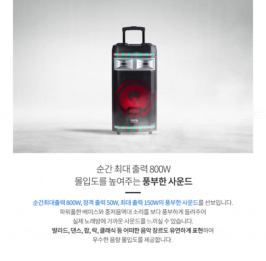 이동식 휴대용 블루투스 앰프 스피커 야외공연 버스킹 행사 노래방 mp3 플레이어 FM 라디오 TF포트 USB포트 AUX 단자 마이크 단자 기타(Guitar) 전용 단자 UHF 무선 마이크 리모콘 2채널 스테레오 지원 확성 기가폰 강의용 행사용 정격 50W 최대출력 150W 순간최대출력 800W 충전식 배터리 볼륨 에코 베이스 트레블 조절 EQ 직관적인 컨트롤러 스피커 라이트 간편한 이동 손잡이 캐리어형 이동 바퀴 - 오호! OHOI