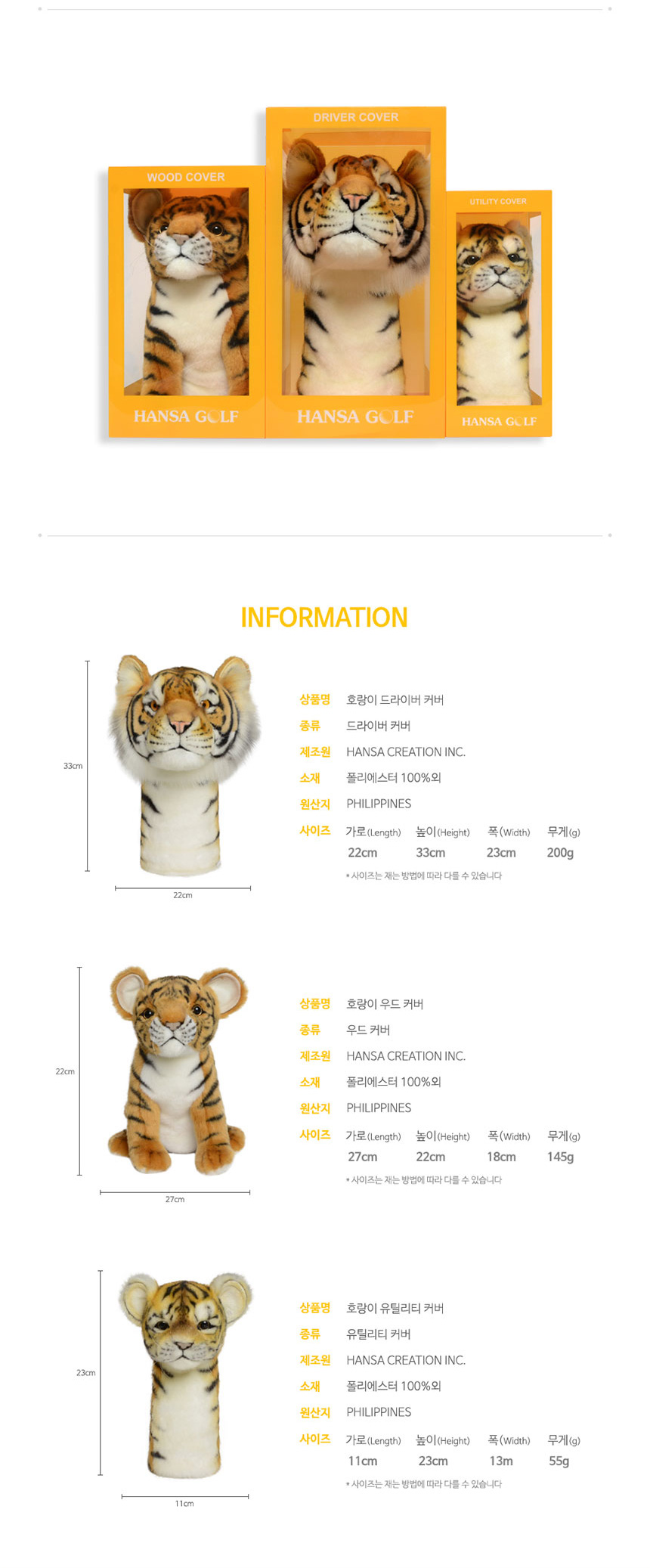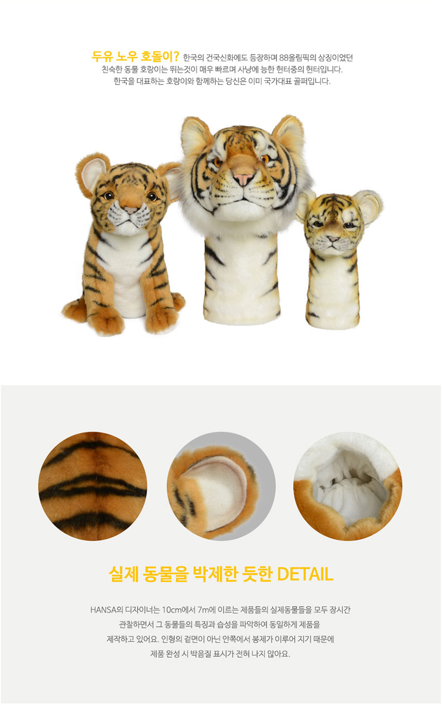 골프 드라이버 우드 유틸 유틸리티 커버 세 골프채 헤드커버 클럽 덮개 카바 헤드카바 실제 동물과 동일하게 제작한 실사 인형 클럽 커버 핸드메이드 극강의 퀄리티 착용감 보호력 안정성을 제공하는 명품 클럽커버 소재 폴리에스터 100% 외 드라이버커버 사이즈 가로 높이 폭 22 x 33 x 23 cm 200g 우드커버 사이즈 27 x 22 x 18 cm 145g 유틸리티커버 사이즈 11 x 23 x 13 cm 55g 호랑이 - 오호! OHOI