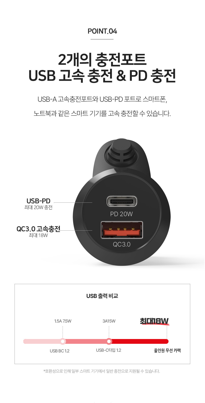 출력 : USB A - QC3.0 출력 - 18W , USB-C 출력 - 20W