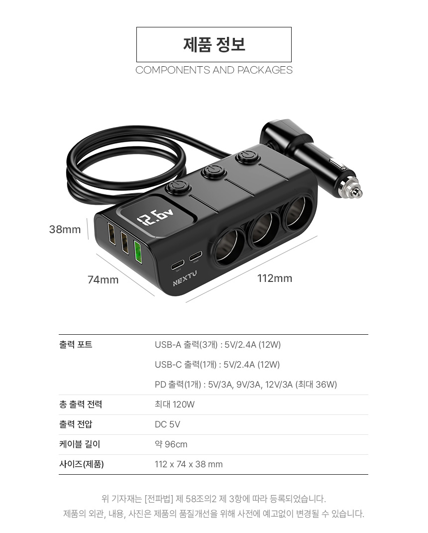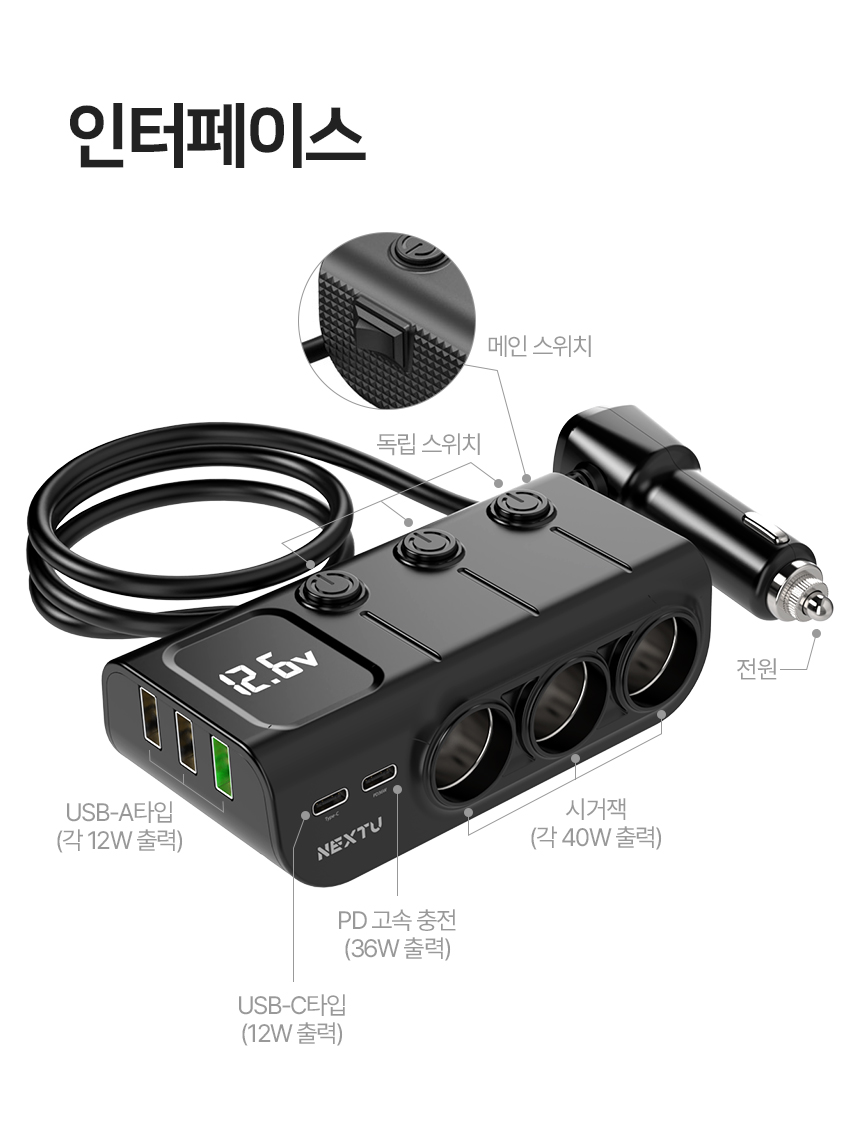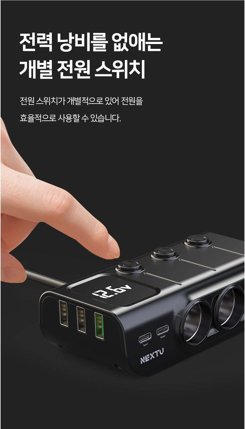 차량용 멀티소켓 3구 시가잭 시거잭 소켓 급속 고속 소켓 용량 120W 12V 24V 승용차 화물차 겸용 분배기 C 타입 1포트 PD 1포트 USB 3포트 Smart IC 칩 단락보호 과전압보호 과전류보호 개별 스위치 전압계 케이블길이 96cm - 오호! OHOI